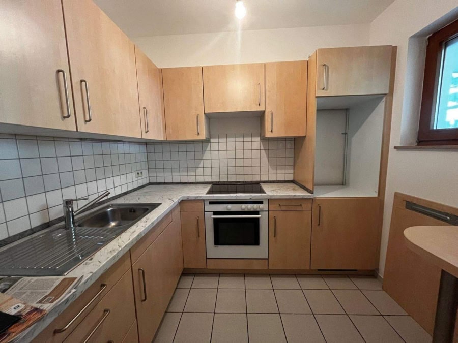 Guter Parkettboden, Holzisofensterelemente, Tapeten, altersgerechtes Badezimmer in weißem Sanitär, komplette Einbauküche